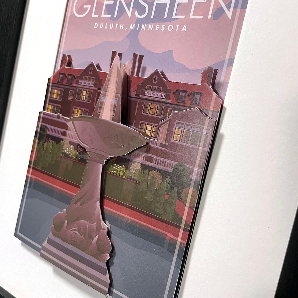A dimensional tribute to the iconic Glensheen Mansion. Skillfully layered cards are precisely engineered to create striking depth and visual complexity, showcasing the architectural grace of this beloved Minnesota landmark.